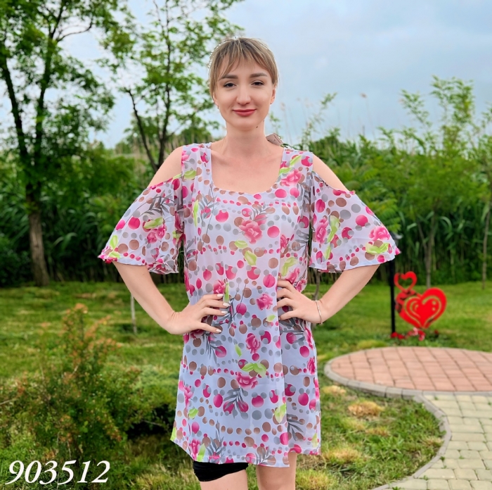 Розмір один до ОГ 110. ОС 115. Тканина: принтований шифон, просвічує . (Довжина -80см)