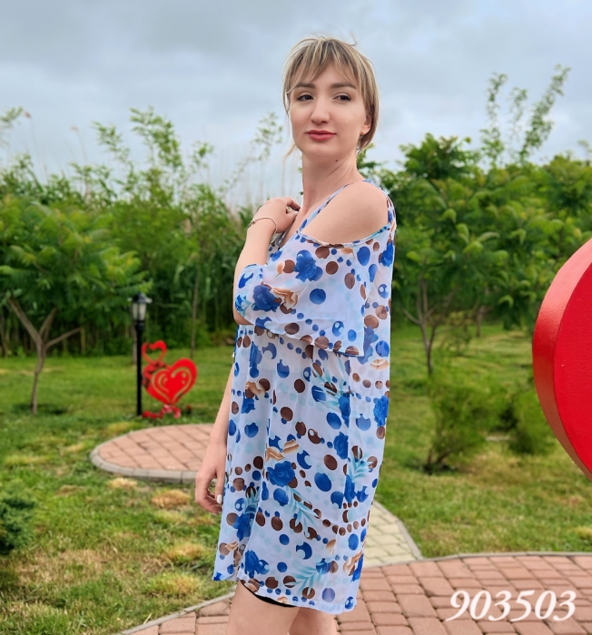 Розмір один до ОГ 110. ОС 115. Тканина: принтований шифон, просвічує . (Довжина -80см)