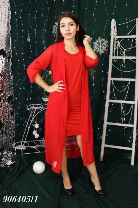 Розмір: 44. Тканина: трикотаж - масло, кардиган шіфон з'ємний. Склад: 30%-віскоза,60%- поліестер, 10% -еластан. Довжина сукні 90см. Довжина кардигану -110см.)