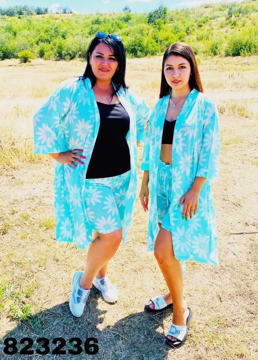 Тканина виробу: креп шифон принт, пояс шорт на гумці та з боків кишені, рубашка під пояс, без гудзиків. Розмір: 42/46, 48/50