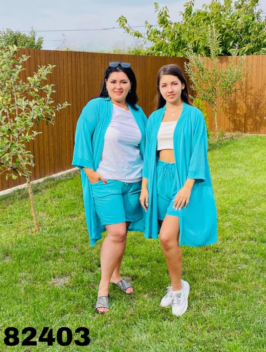 Тканина виробу: креп шифон, пояс шорт на гумці та з боків кишені, рубашка під пояс, без гудзиків. Розмір: 42/46