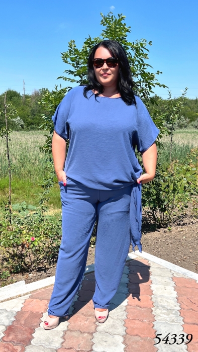 тканина: американський креп жатка (Склад 35% бавовна, 40% віскоза, 25% поліестер) Розмір: 52. 56 Штани прямого крою з кишенями, пояс на резинці. Довжина блузи - 75 см, Довжина штанів - 110см