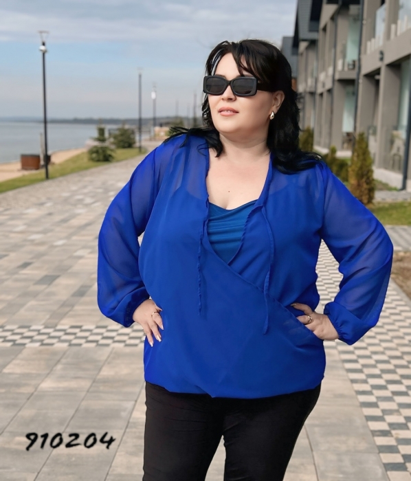 Шифонова жіноча блузка мод.9102 Ціна 650грн Розміри 46/48,50/52,54/56,58/60,62/64 ЦІНА 650ГРН 46/48 ОГ 110 ОС 110 50/52 ОГ 120 ОС 120 54/56 ОГ 130 ОС 130 58/60 ОГ 140 ОС 140 62/64 ОГ 150 ОС 150 ДОВЖИНА 75 СМ ДОВЖИНА РУКАВА 67 СМ НА РЕЗИНЦІ МАЄЧКА ТРИКОТАЖ МАСЛО, НЕ ПРИШИВНА НА БРЕТЕЛЯХ ОСНОВА ШИФОН ВІЛЬНОГО ПОКРОЮ